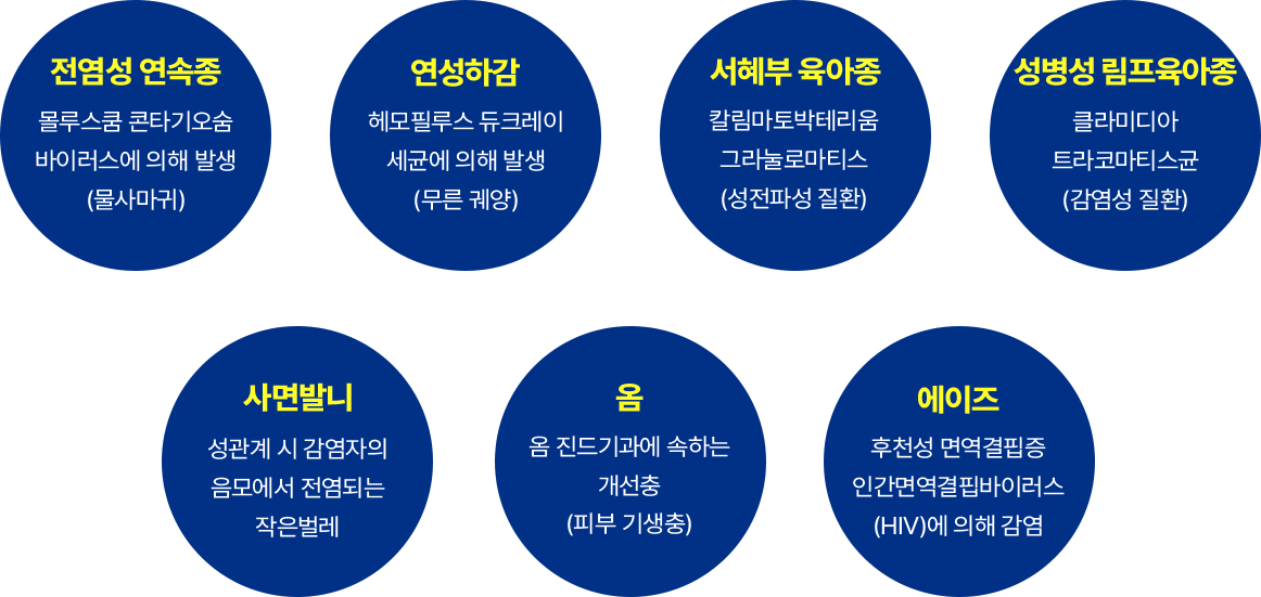 넓은 의미의 성병은 성교 외에도 접촉으로 전염되며, 전염성 연속종, 연성하감, 사면발니, 옴 등이 포함됩니다.