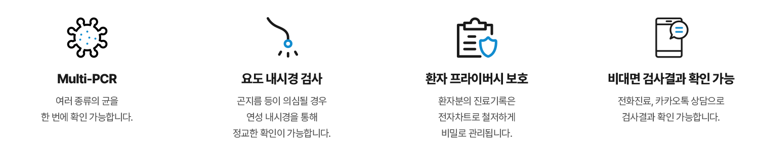 숙련된 전문의가 최신 의료 장비를 활용하여 유전자증폭검사, 일반검사, 굴잉크 검사, 혈액 검사 등을 통해 원인을 명확히 규명합니다.